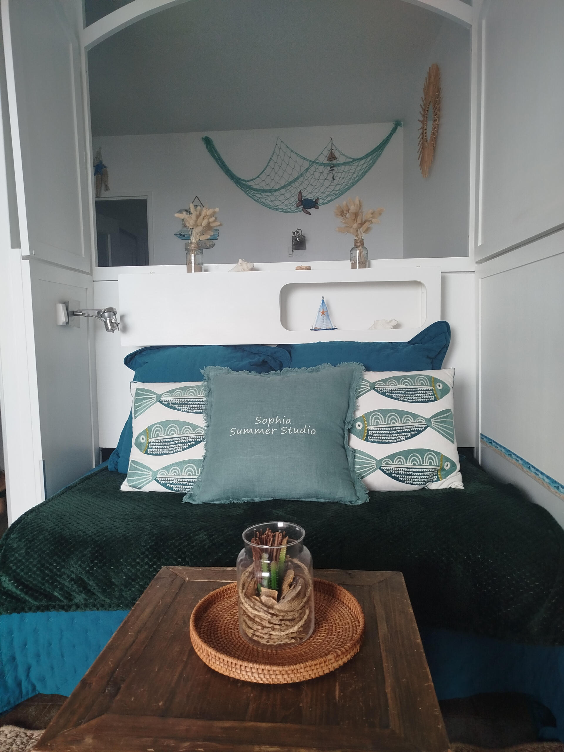 Pour plus d’intimité, des volets intérieurs en bois blanc rabattables et une porte coulissante permettent de séparer les espaces nuit.